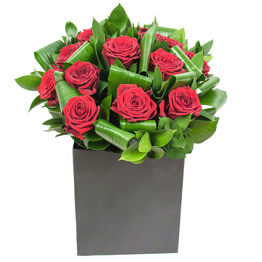 Introduce elegance to your home with our Stunning Red Rose Arrangement. This beautiful bouquet features vibrant red roses paired with lush aspidistra leaves and delicate ruscus, creating a unique and captivating floral display.